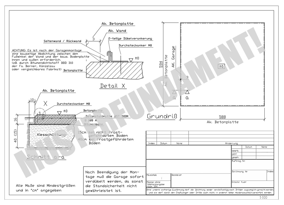 Sie erhalten alle planerischen Unterlagen für Ihre Knopp Stahlgarage von uns wie Fundamentplan, Statik und auch Raumberechnung mit einer Produktbeschreibung. Mit diesen Plänen können Sie ein regionales Bauunternehmen mit der Fundamenterstellung beauftragen. Bei entsprechenden Kenntnissen können Sie das Fundament auch in Eigenleistung erstellen.