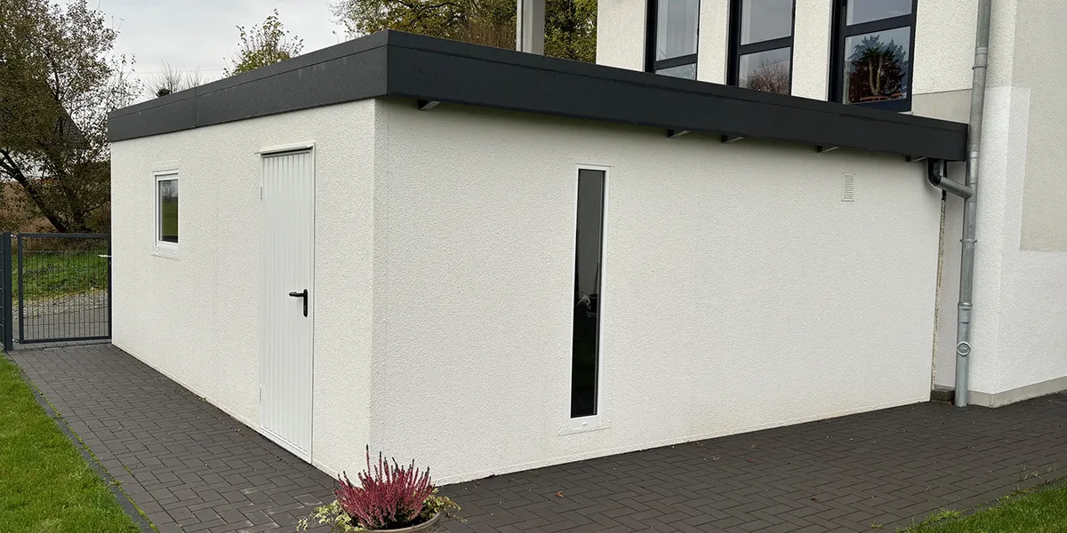 Durch verschiedene Gestaltungsmöglichkeiten lässt sich die Garage perfekt an das Design der Hausfassade anpassen. Standardmäßig liefern wir die Stahlgaragen mit einem weißen Mineralputz. Der Putz besteht aus einer flexiblen Glasfasermatte und einem regenabweisenden, faserverstärkten Acryl-Spritzputz in der Körnung 2.0. Auf Wunsch sind auch andere Farben möglich. Somit kann die Garage auch als farbliches Gestaltungselement individuelle Akzente setzen.